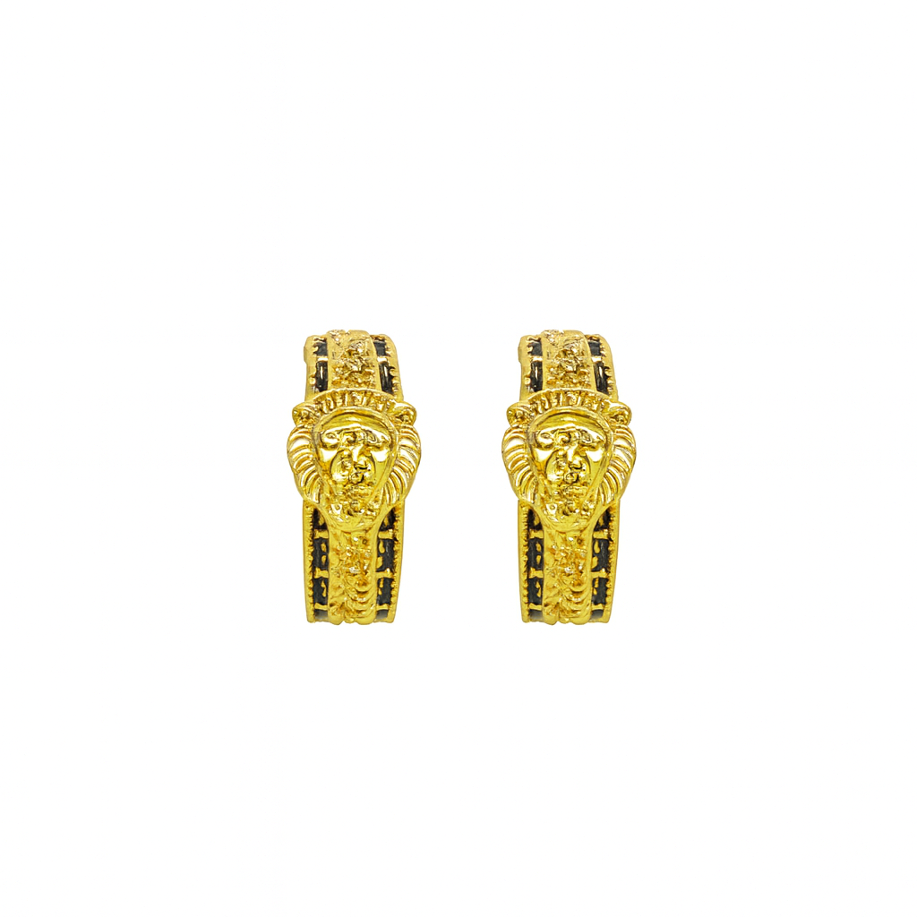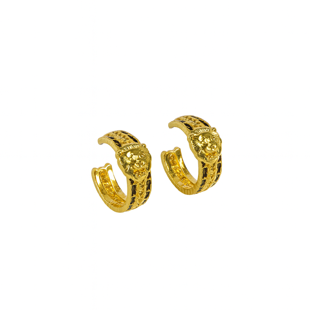 Aros dorados con diseño de león en relieve y detalles en negro. Un accesorio llamativo que mezcla fuerza y sofisticación.