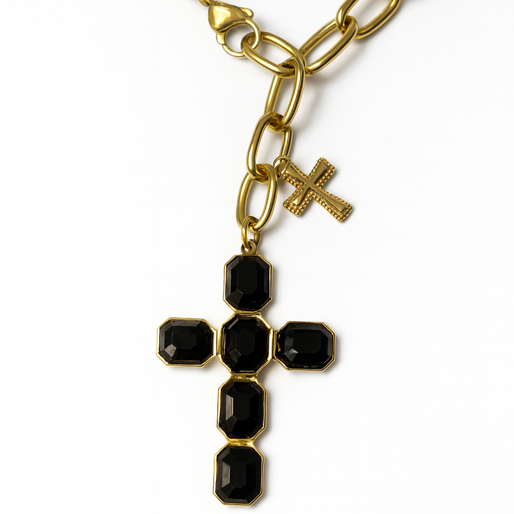 Collar dorado de eslabones con colgante de cruz en negro y mini cruz adicional. Un diseño audaz y atemporal.