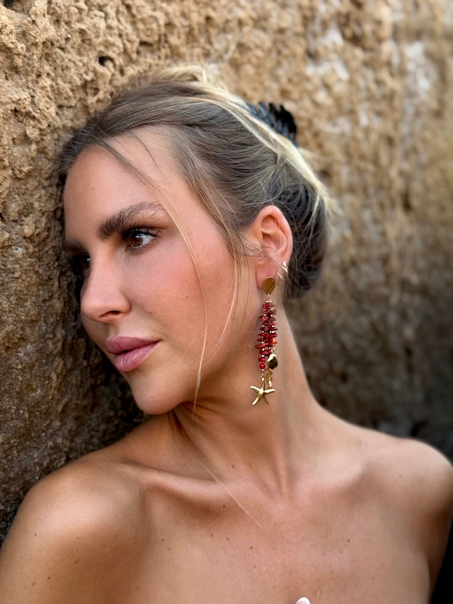 Inspirados en la vibrante esencia caribeña de la isla de Martinica, estos pendientes capturan la calidez del sol y el encanto del mar. Con cuentas de coral rojo natural y colgantes dorados en forma de estrella de mar, caballito de mar y concha, evocan un paisaje tropical lleno de vida y color. Perfectos para llevar el espíritu del verano contigo todo el año.