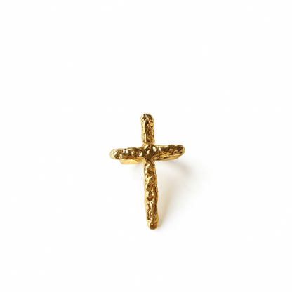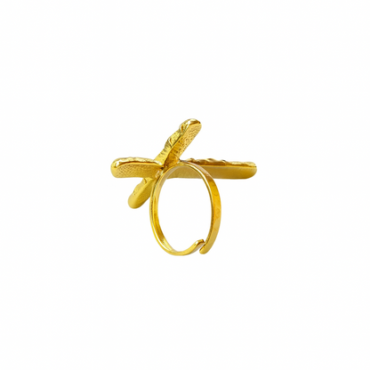 Anillo ajustable en dorado con diseño de cruz texturizada. Audaz, moderno y lleno de carácter.