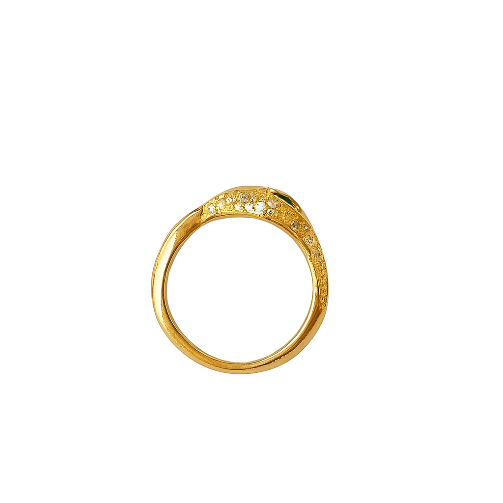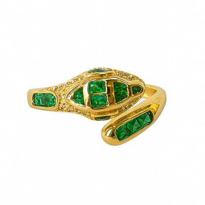 Anillo dorado con circonitas verde esmeralda. Elegante, fino y sofisticado.